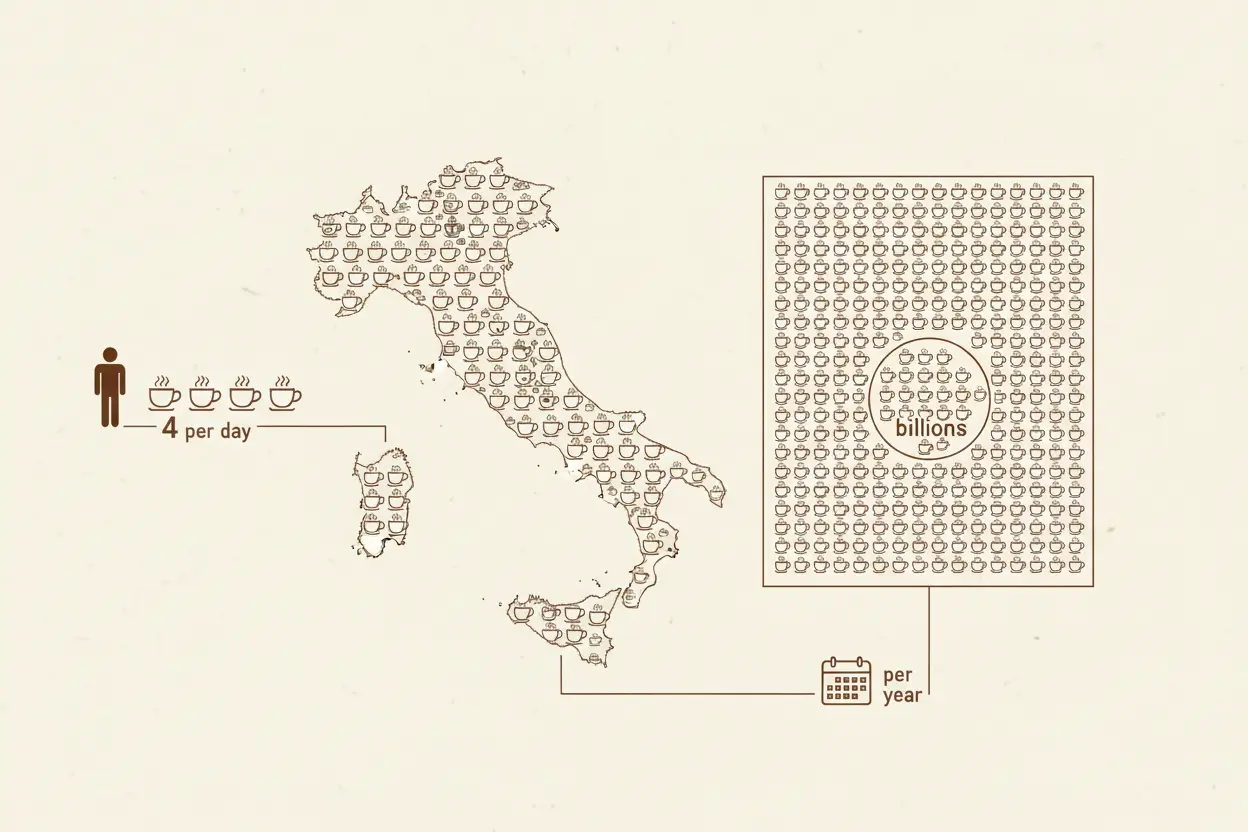 Gli italiani consumano in media 4 tazze di caffè al giorno, per un totale di circa 37 miliardi di tazze all’anno.