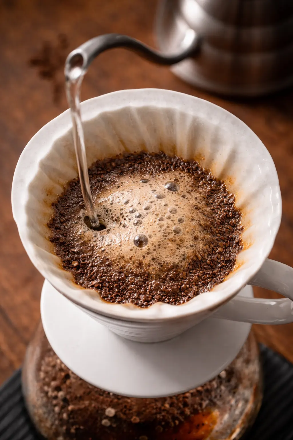 - Riprendi con versate lente a spirale fino al tuo rapporto (es. 1:16 → 240 g d’acqua totale).